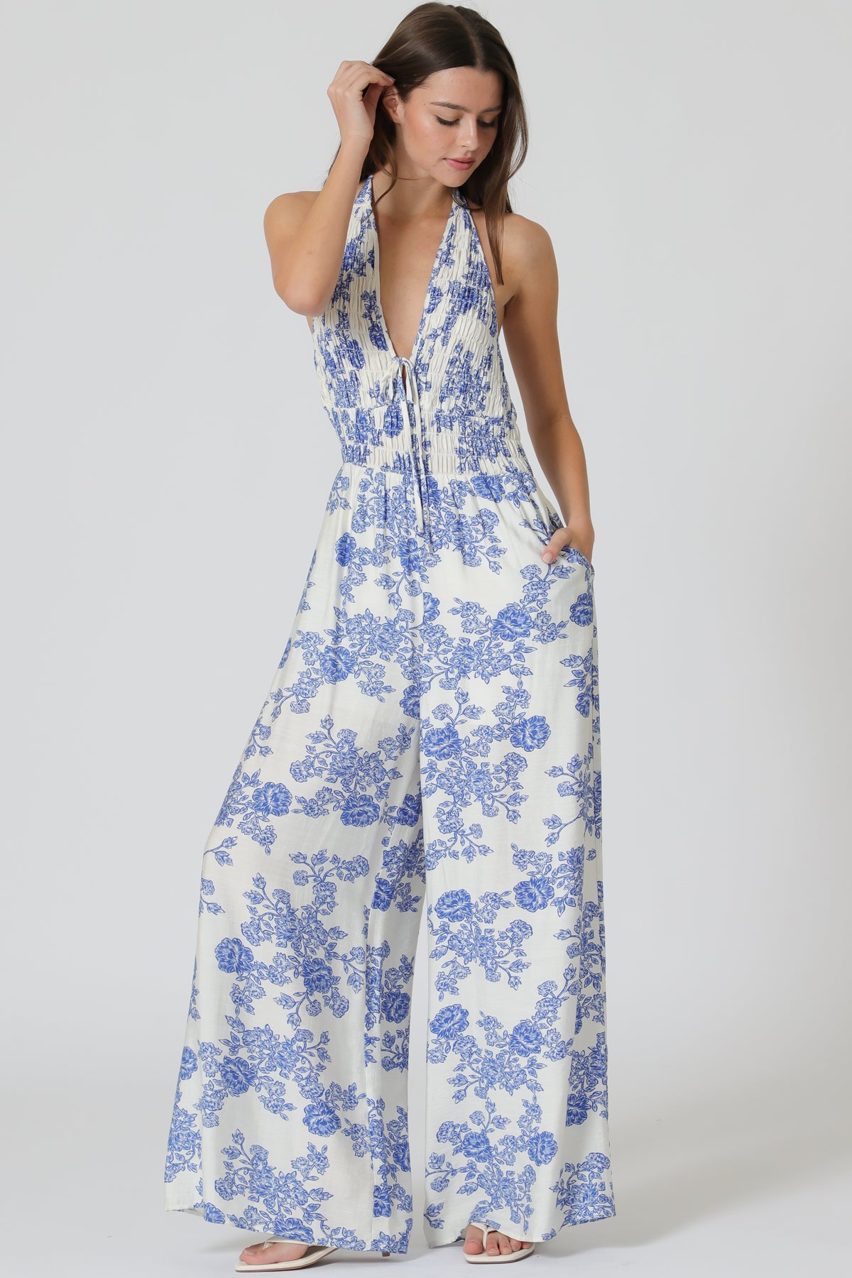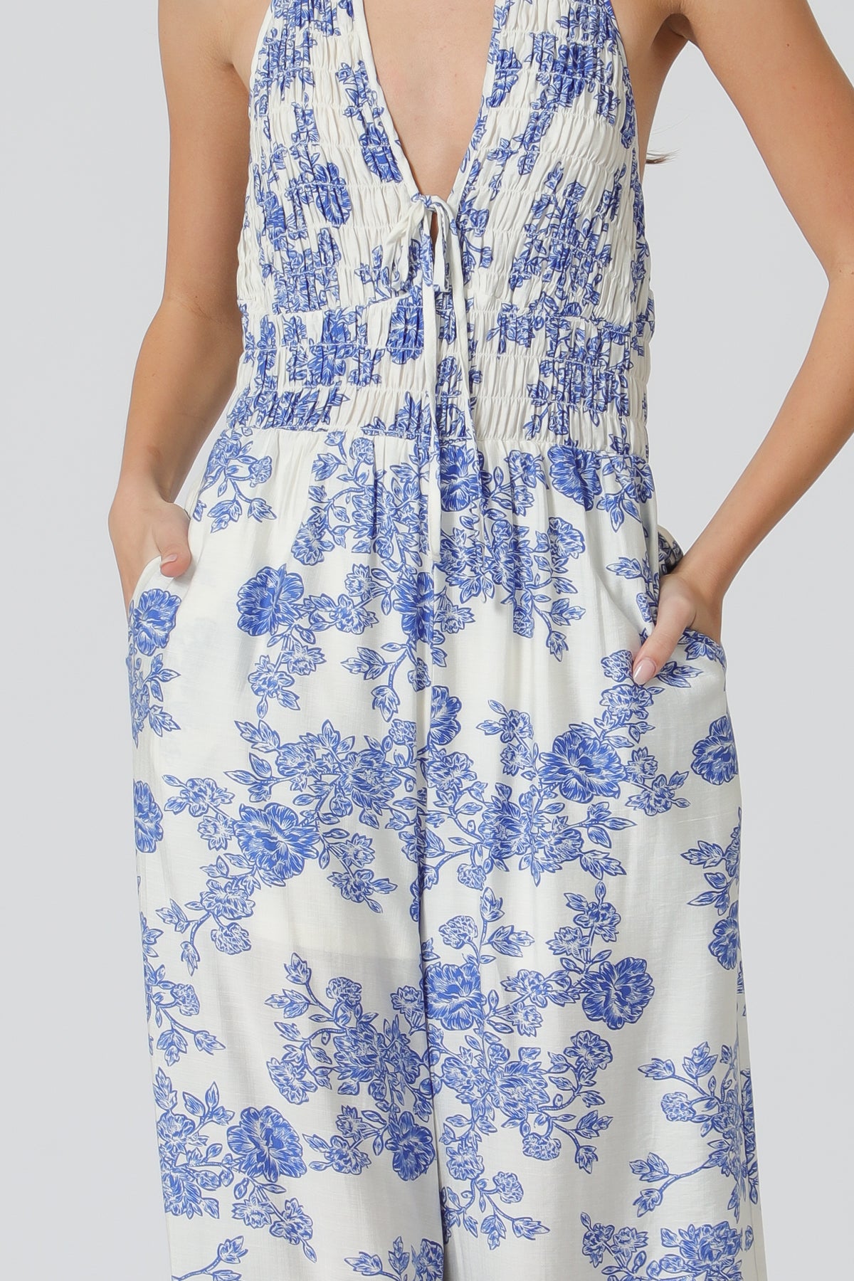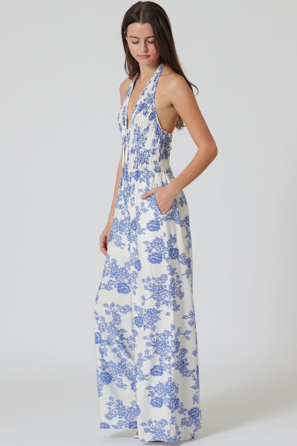Light and easy to wear, this halter maxi jumpsuit features a deep V neckline with a front tie and a smocked elastic bodice for a comfortable, flattering fit. The halter tie-back design and wide, flowy legs create a breezy silhouette, while side pockets add everyday convenience. Finished in a soft blue floral print—perfect for warm days and getaways.