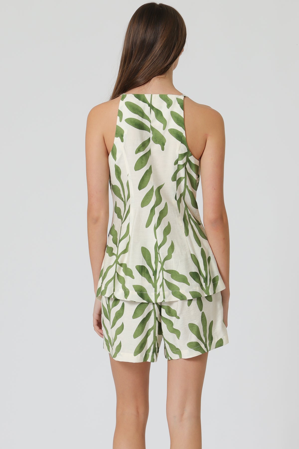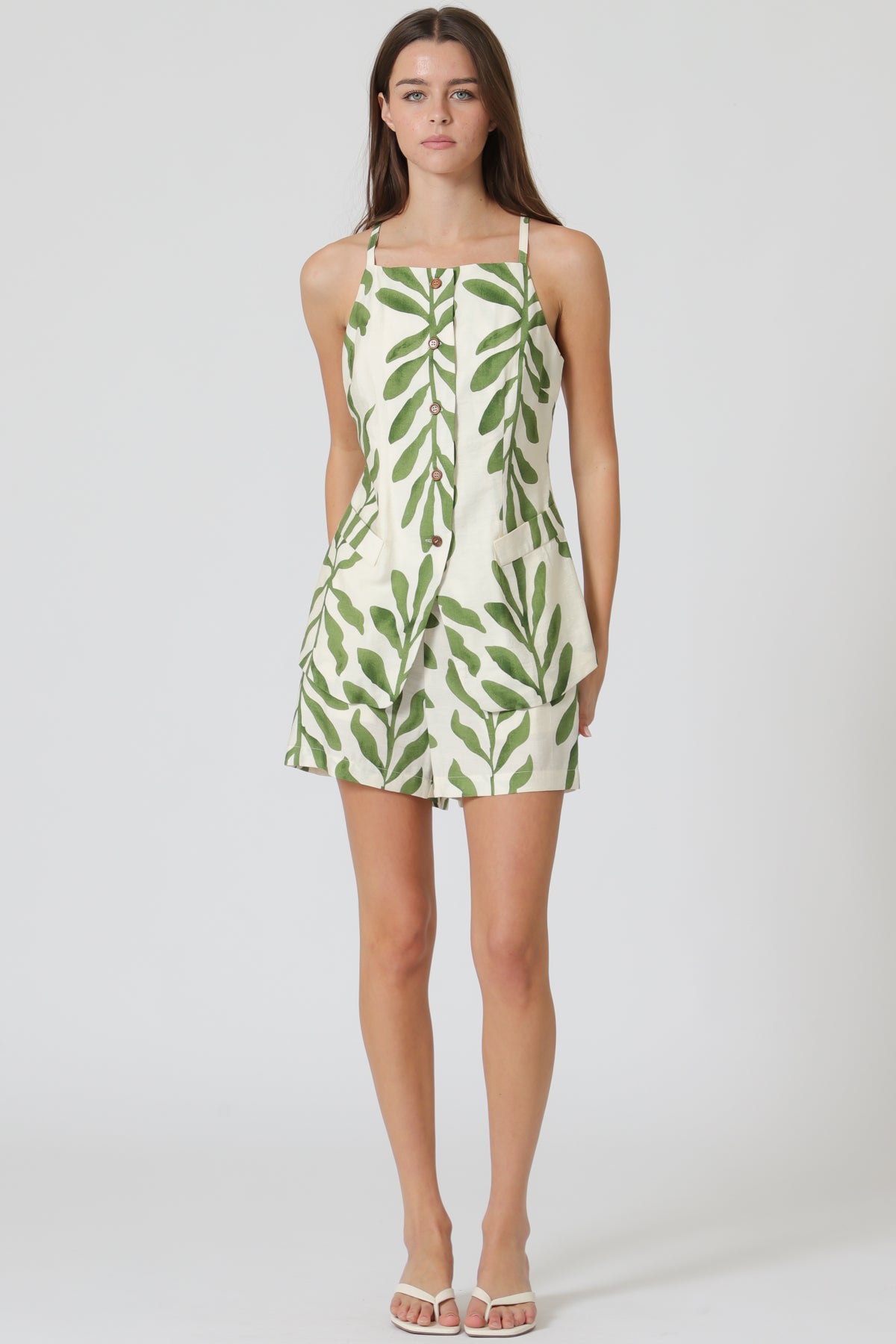 Fresh and easy for warm days, this sleeveless top and shorts set features a button-down front and a relaxed, flattering fit. The lightweight fabric keeps it breathable and comfortable, while the matching shorts include pockets for everyday ease. Finished in a bold green leaf print, it’s a simple, put-together look you can wear together or mix and match.