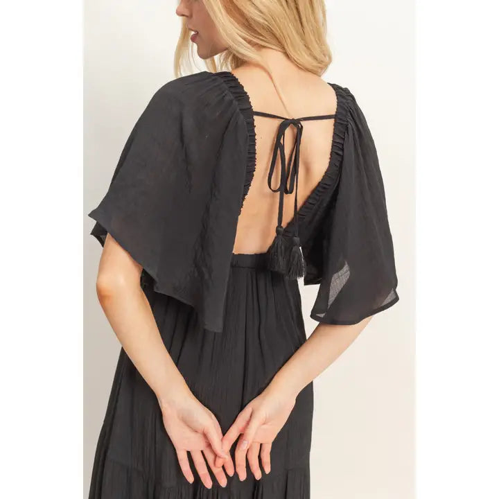 This maxi dress features elegant flutter sleeves and a plunging V-neckline for a stylish look. The empire waistline creates a flattering silhouette, while tiered layers add subtle volume. Pair with strappy sandals and a sun hat for a breezy summer ensemble. 100% polyester